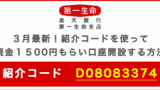 以下の関連記事に、現金1,500円もらい口座開設する方法を紹介コード付きで解説していますので、ぜひチェックしてみてくださいね。